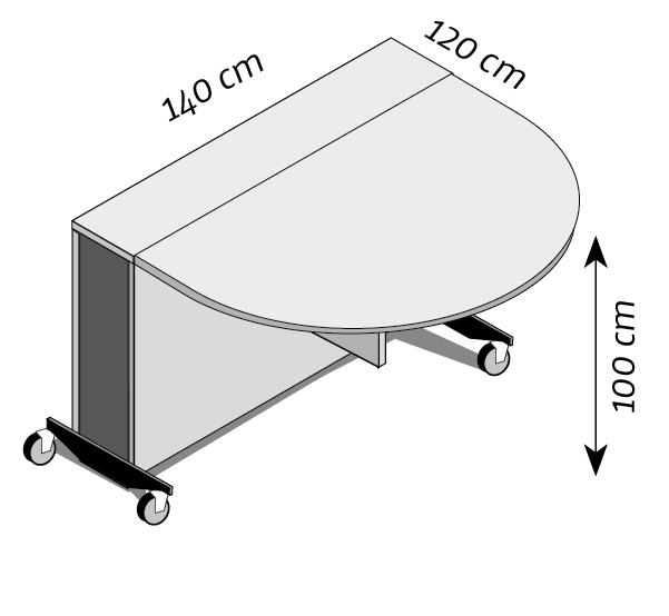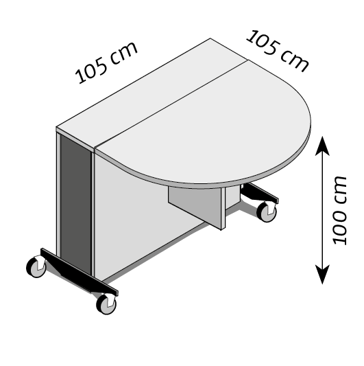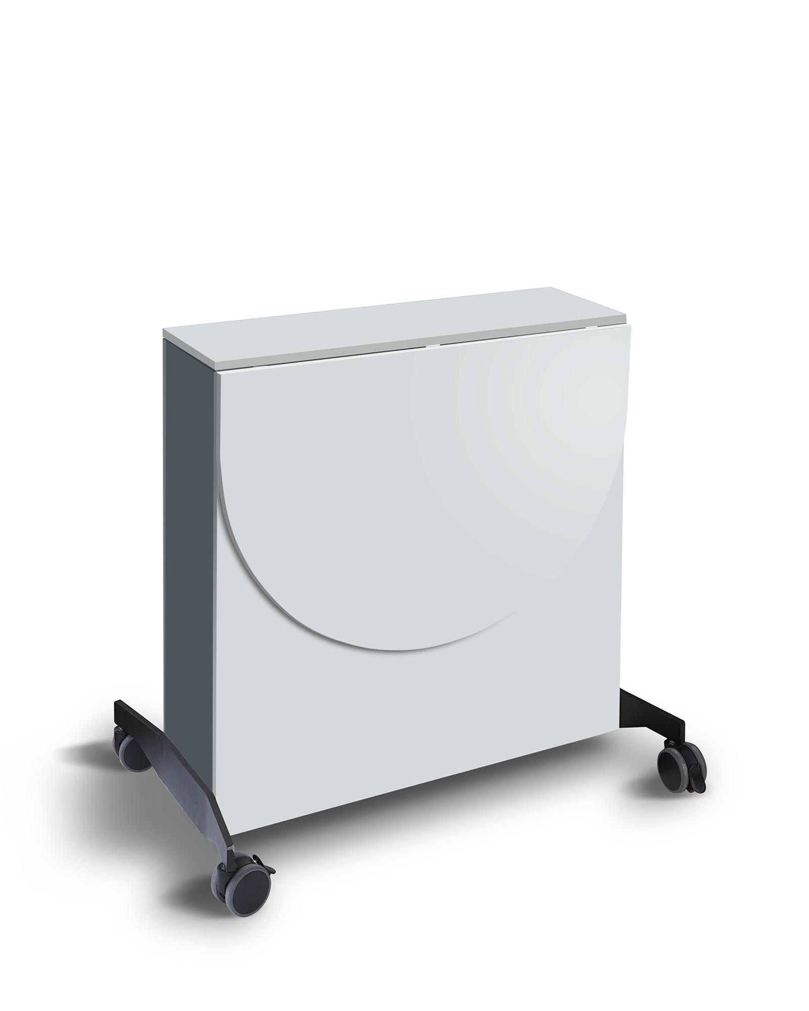 Die halbrunde Tischplatte ist hängend am Korpus angebracht. Sie lässt sich mit einem Handgriff in die Arbeitsposition hochschwenken und fixieren.
