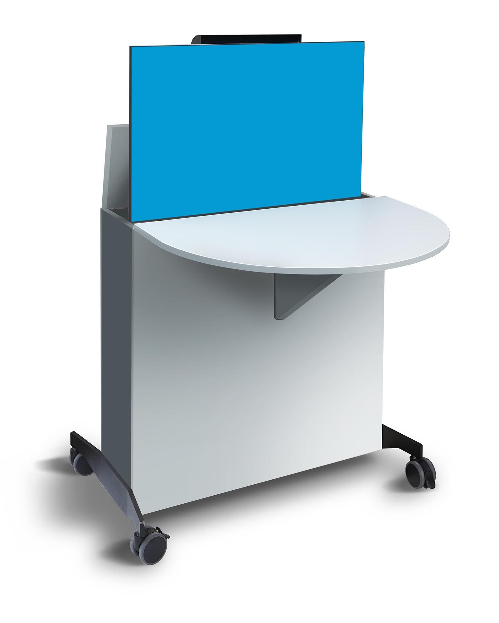 Ein mobiler Bildschirmschrank für das kurze Gespräch. Im Handumdrehen wird er zum Stehtisch und bietet nach Bedarf allerfeinste Medientechnik: Bildschirm, kabellose Netzwerktechnik, Internetzugang, Präsentationssystem, Videokonferenzsystem etc