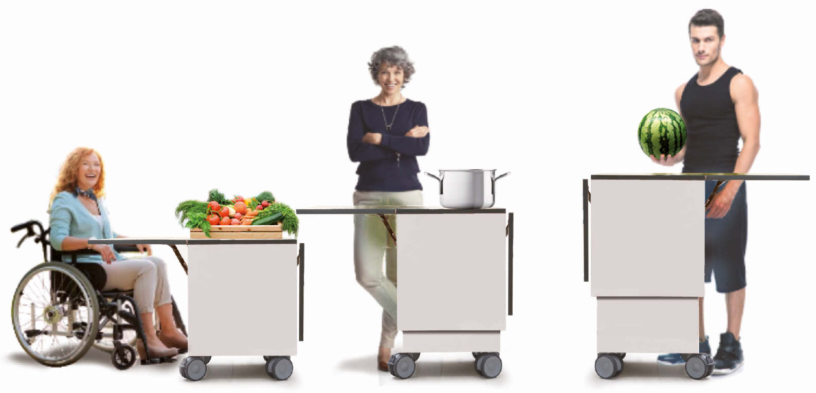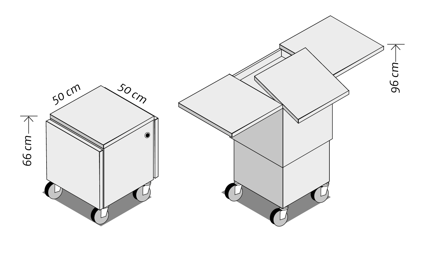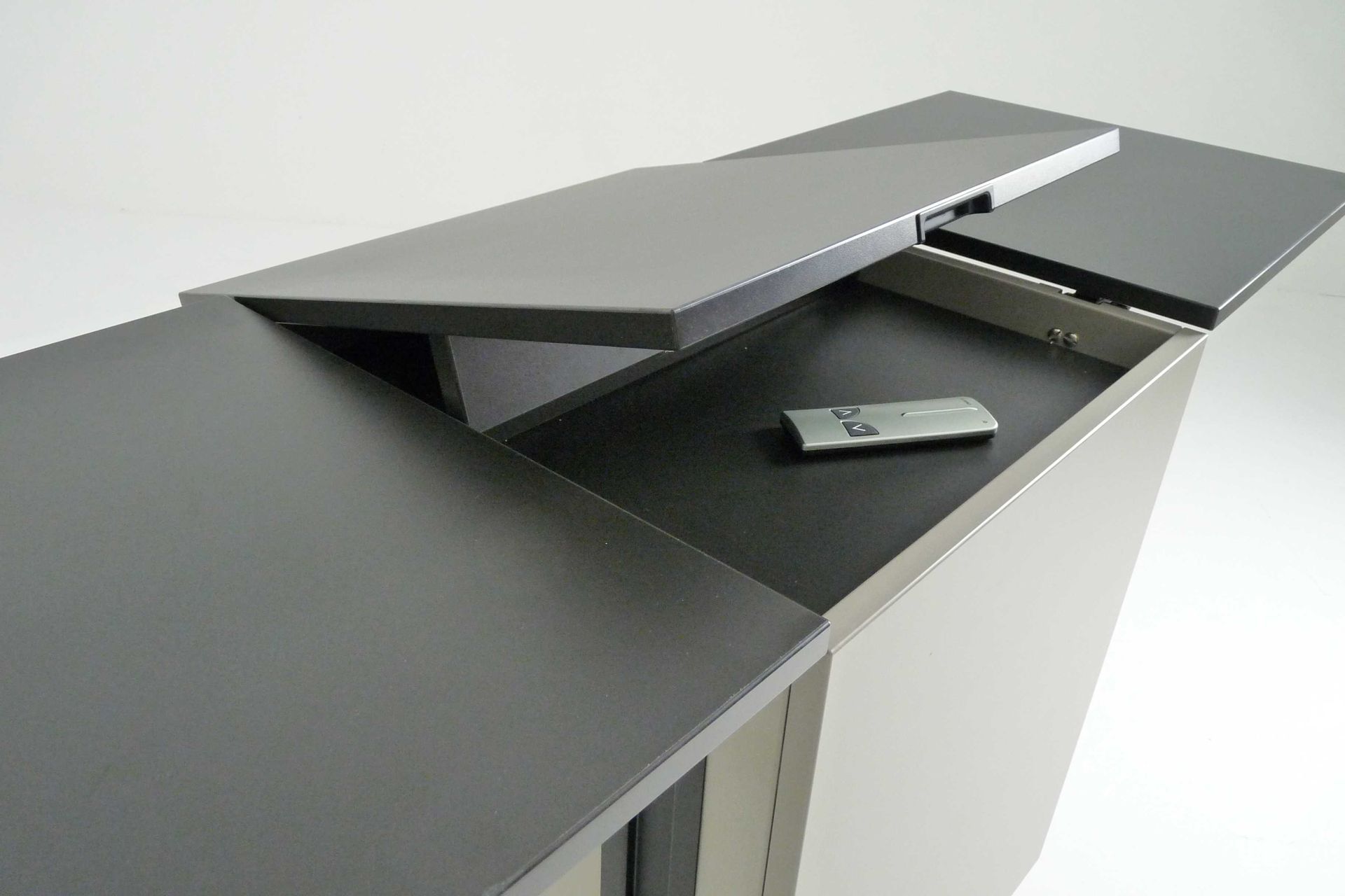 Das stufenlos verstellbare Liftmöbel ist mit einer elektromotorischen Höhenverstellung. ausgestattet, die über ein Akku betrieben wird. Kern der Hebetechnik ist eine