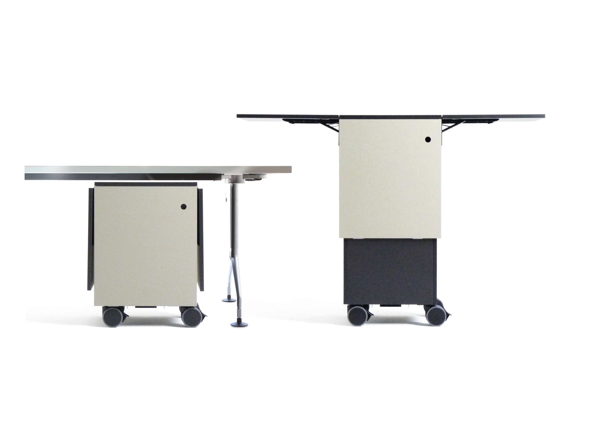 Teleskop-Hubsäule, die über einen Akku gespeist wird und unabhängig vom Stromnetz arbeitet. Die beiden seitlichen Tischplatten werden ganz einfach hochgeklappt und arretieren in der Endposition. So lässt sich die Arbeitsfläche auf eine Breite von 150 cm verdreifachen.
