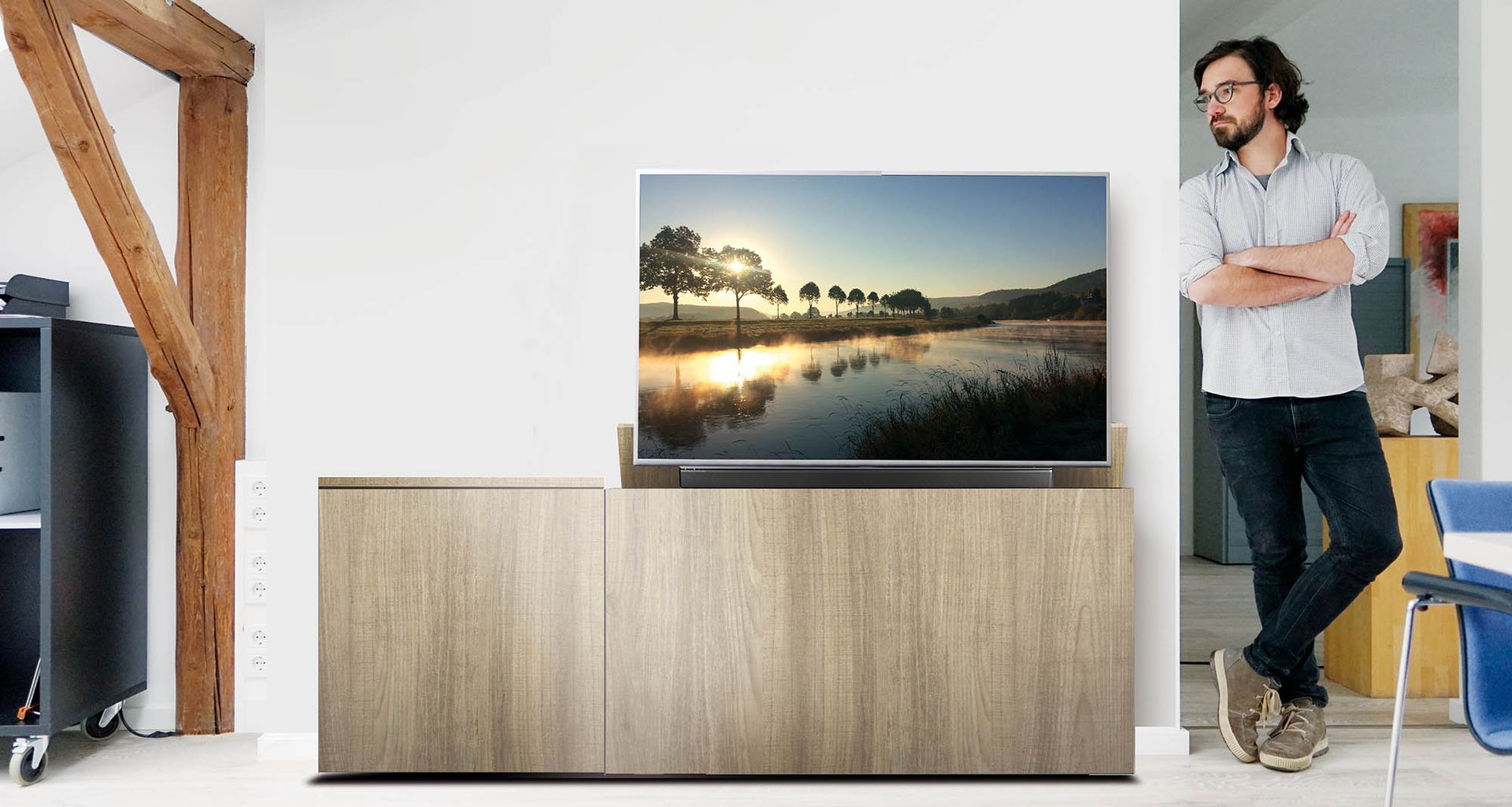 Der Bildschirmlift kann per Fernbedienung aktiviert werden. Der Bildschirm kann bis zu einem Meter aus dem Gehäuse fahren. Eingebaut ist eine Teleskophubsäule vom Marktführer LINAK, die ursprünglich für höhenverstellbare Schreibtische konzipiert wurde: Leise, hubstark und mit einem Kollisionssensor ausgestattet. Das Beste, was es am Markt gibt!
