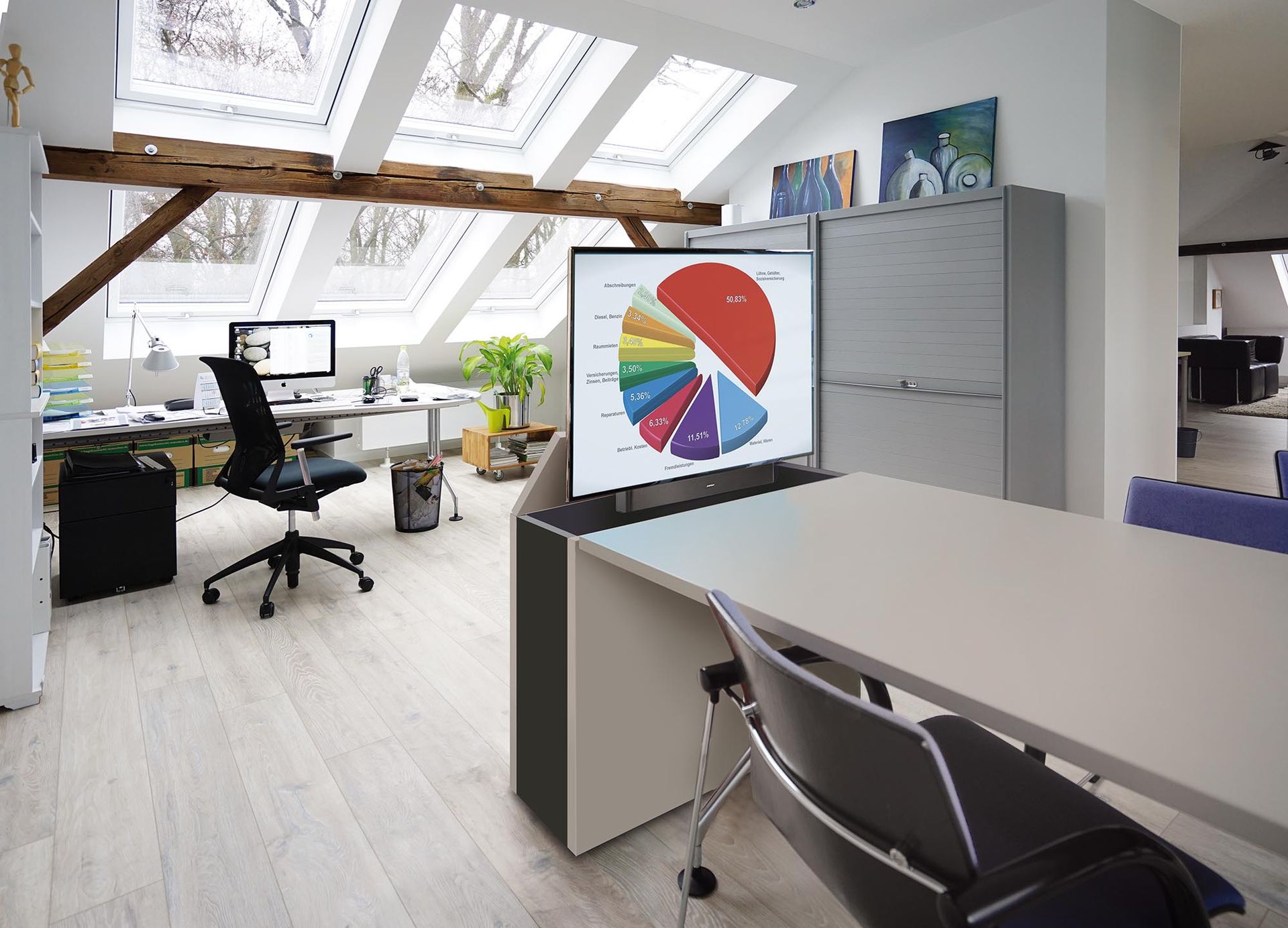Nein! Das unscheinbare Sideboard entpuppt sich als professioneller Büroarbeitsplatz. Die Tischplatte wird einfach hochgeschwenkt, Die Beine darunter ausgeklappt und der fast ein Meter breite 43"-Bildschirm wird aus dem Gehäuse gefahren. Sie können starten!